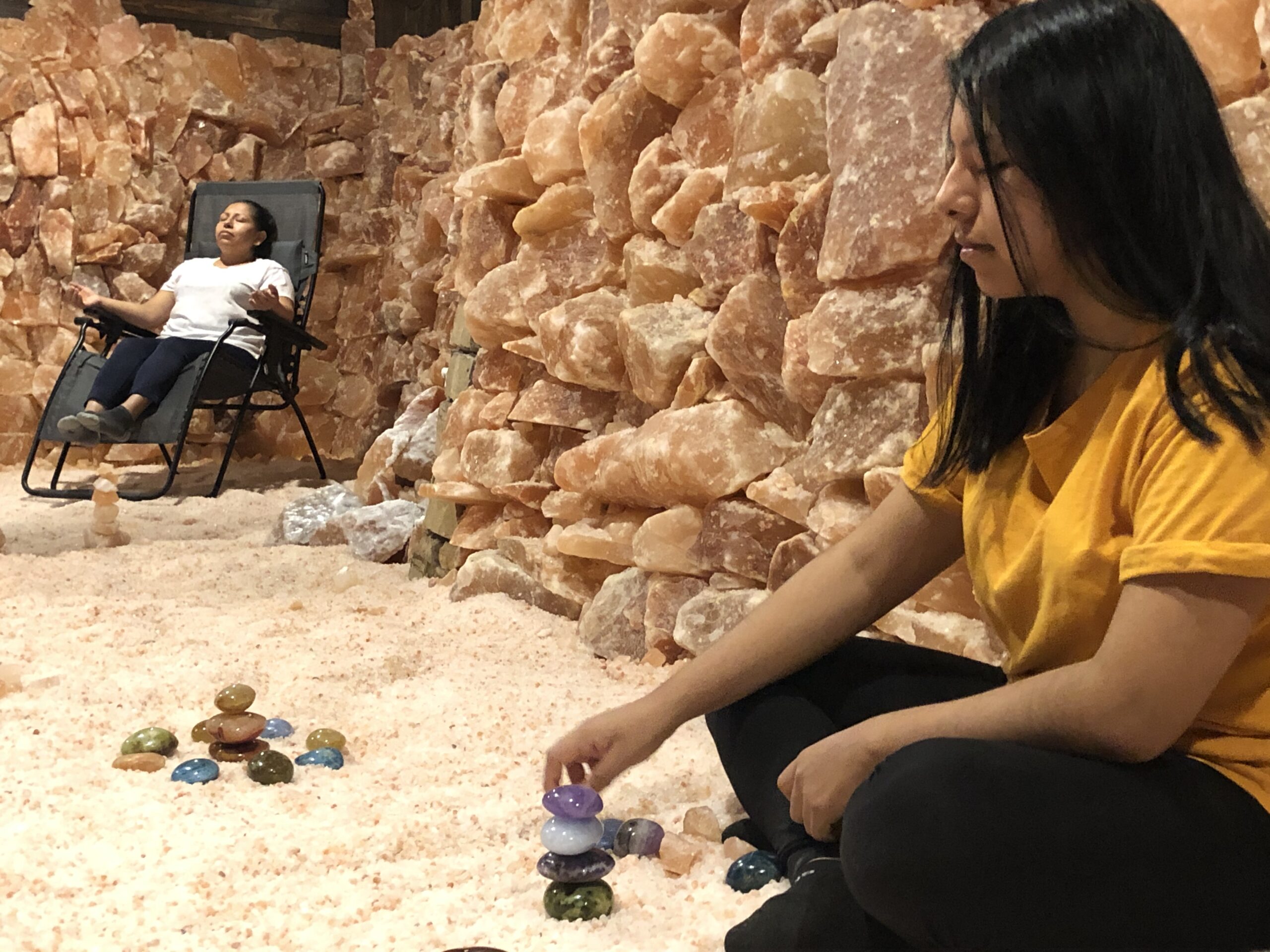 Our nature INSPIRED salt cave is 550 square feet with 9 foot ceilings. We keep our temperature in the cave around 70 degrees, and the humidity is held between 50-60%. This carefully regulated climate allows our cave to be completely sustainable and keeps our cave growing. There is no steam so you will not perspire during the session. If you should feel chilly we provide blankets. We have secure locker cabinets to lock up your valuables. No cell phones, computers or food and drink are permitted in the cave. These are quiet sessions, please be mindful during the session.